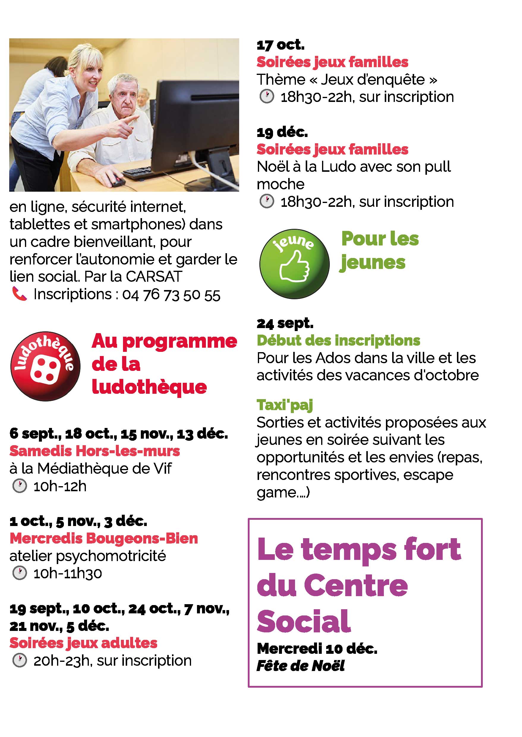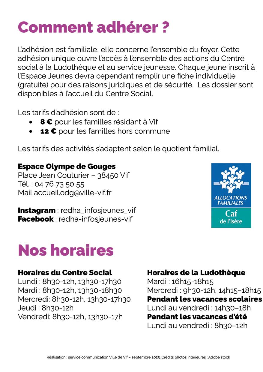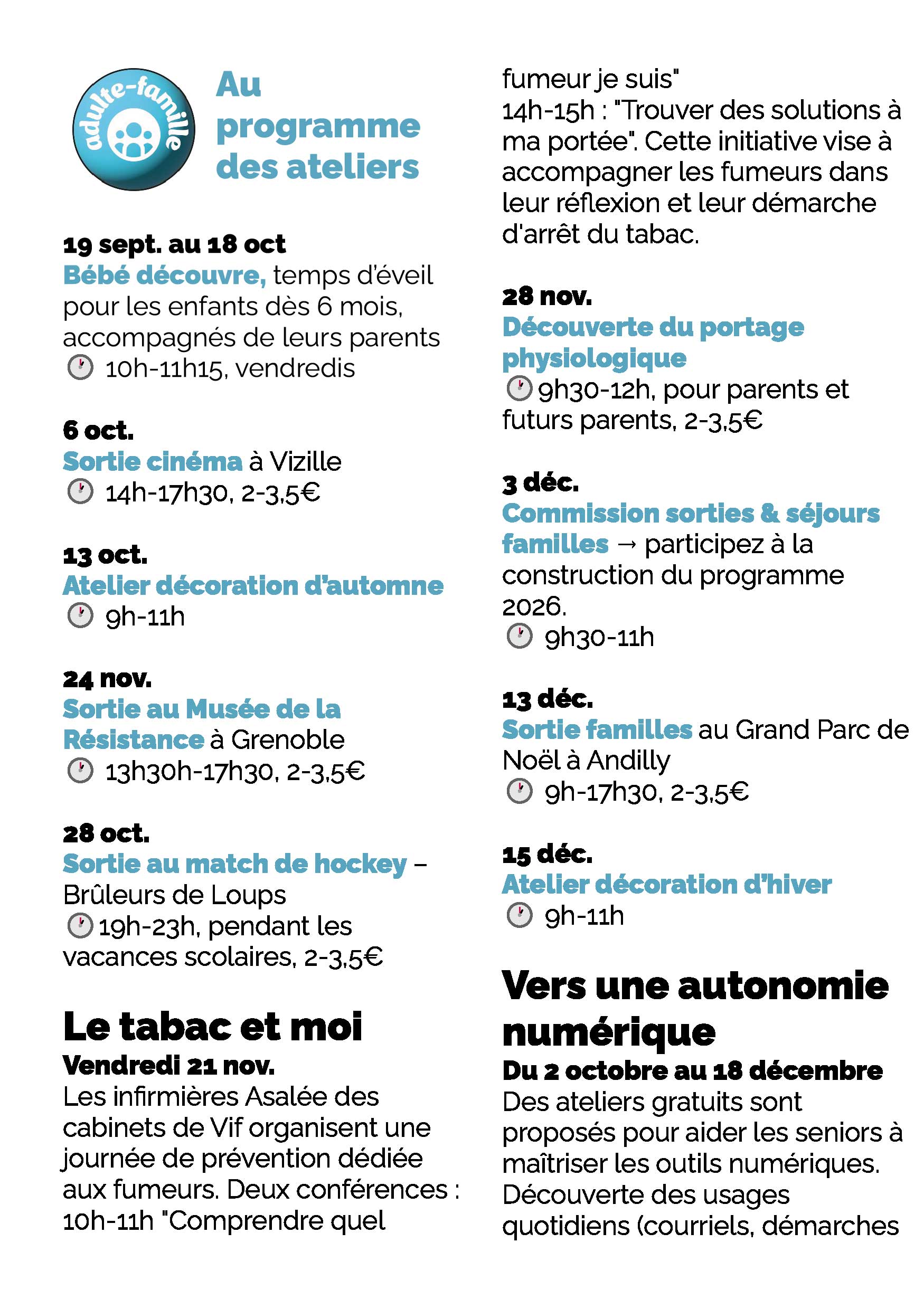 Le Centre Social de Vif dévoile sa programmation trimestrielle d’octobre à décembre 2025, riche en activités pour tous les publics : adultes, familles, jeunes et enfants.