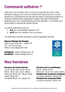 L’adhésion familiale est unique et ouvre l’accès à toutes les activités du Centre Social, de la ludothèque et du service jeunesse :