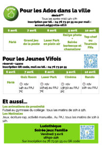 Pendant les vacances scolaire, le Centre Social propose de nombreuses activités pour tous les âges. Le service jeunesse a aussi une programmation créative pour les Ados dans la ville et les Jeunes Vifois.